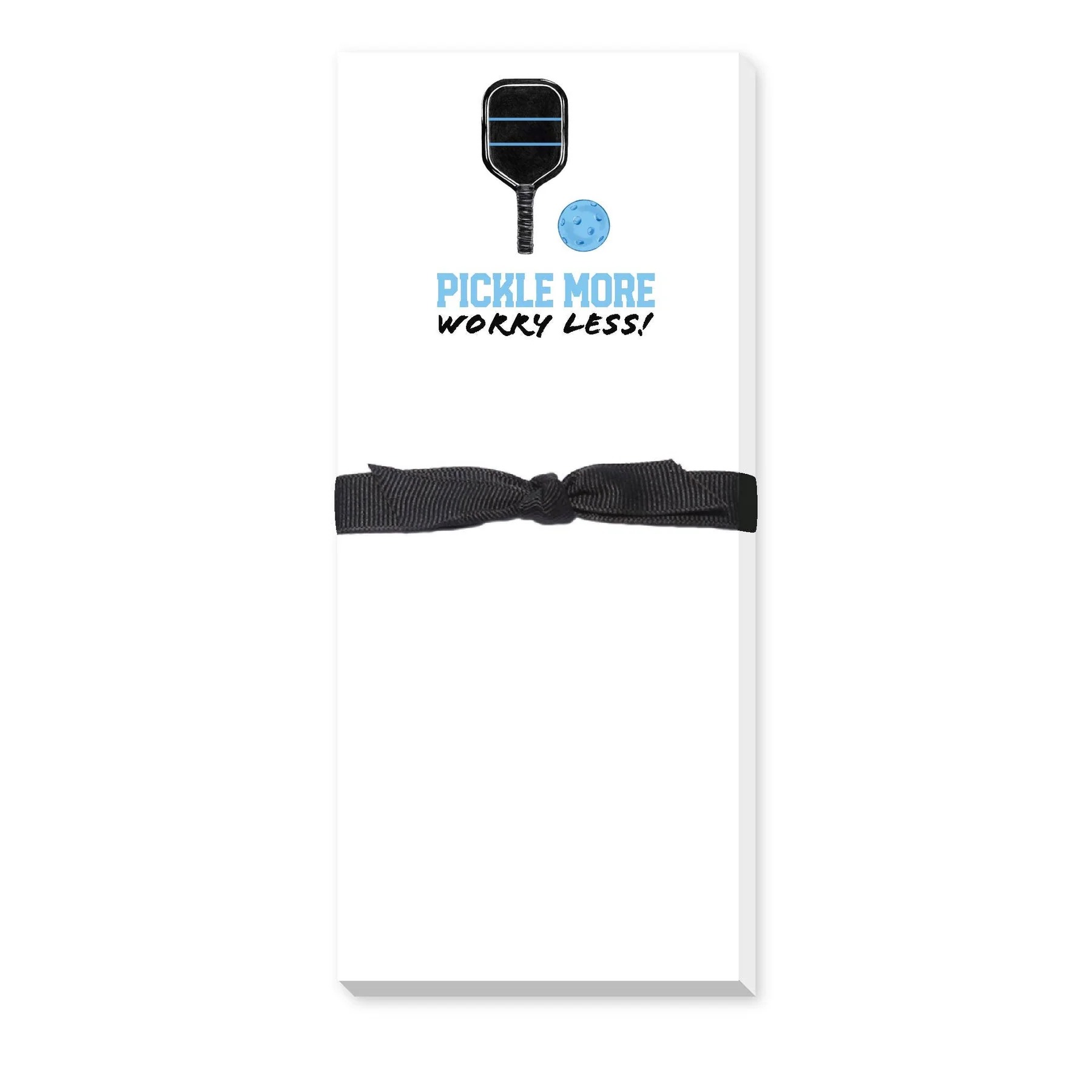 3.67 X 8.550 SHEET NOTEPAD. Wrapped in clear cellophane with black grosgrain ribbon accent."PICKLE MORE, WORRY LESS".